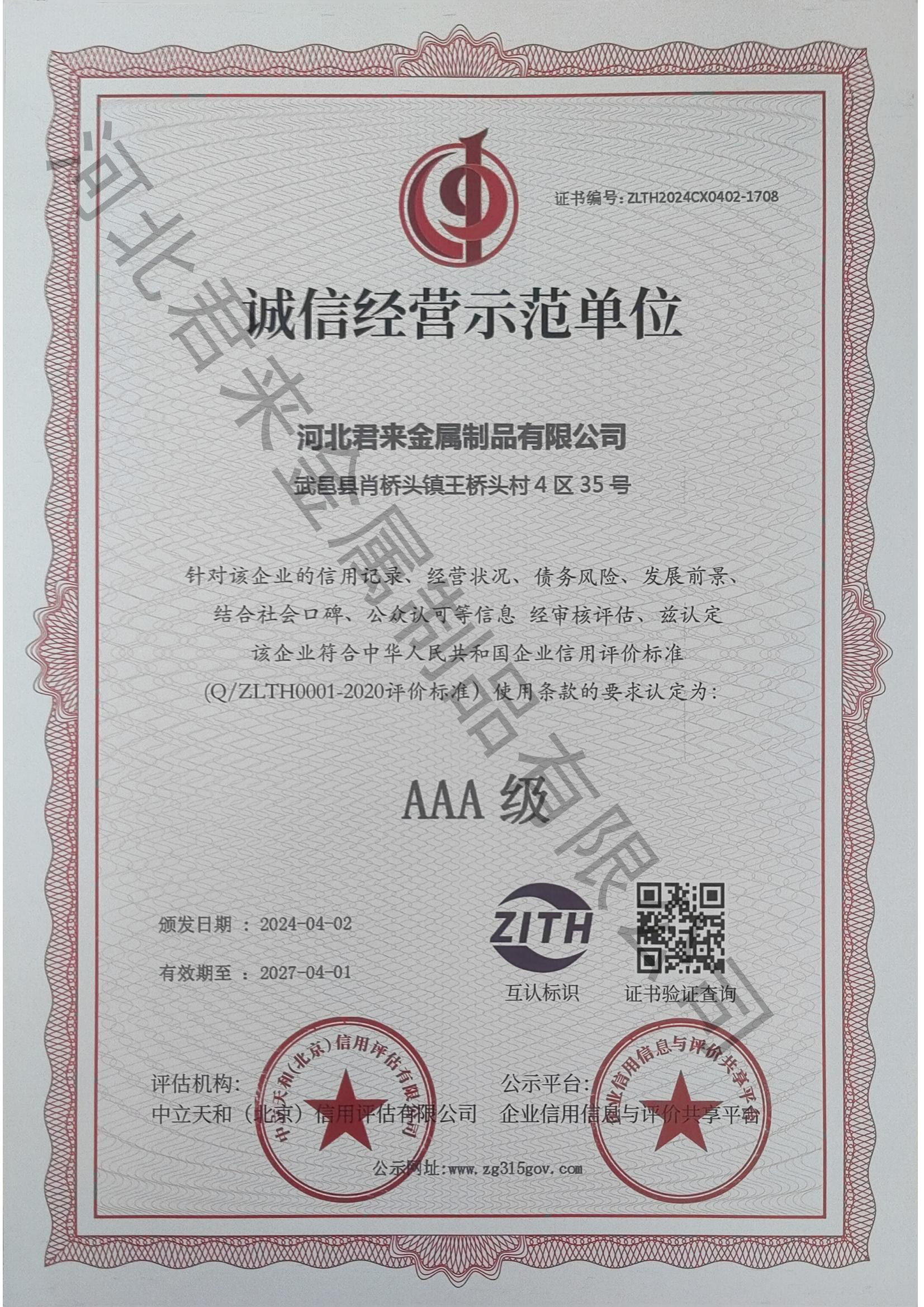誠(chéng)信經(jīng)營(yíng)示范等級(jí)證書(shū)