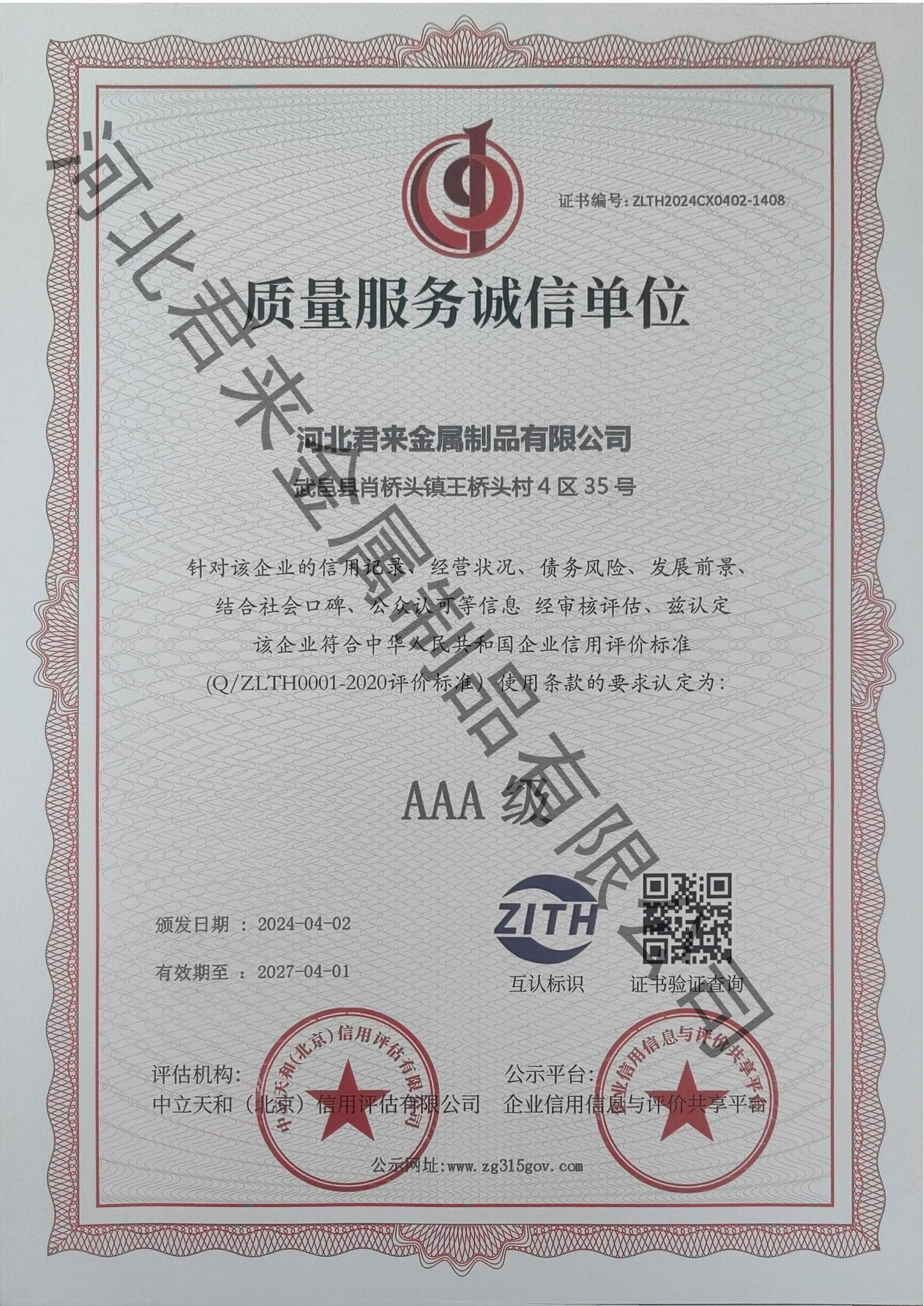 質(zhì)量服務(wù)誠(chéng)信等級(jí)證書(shū)