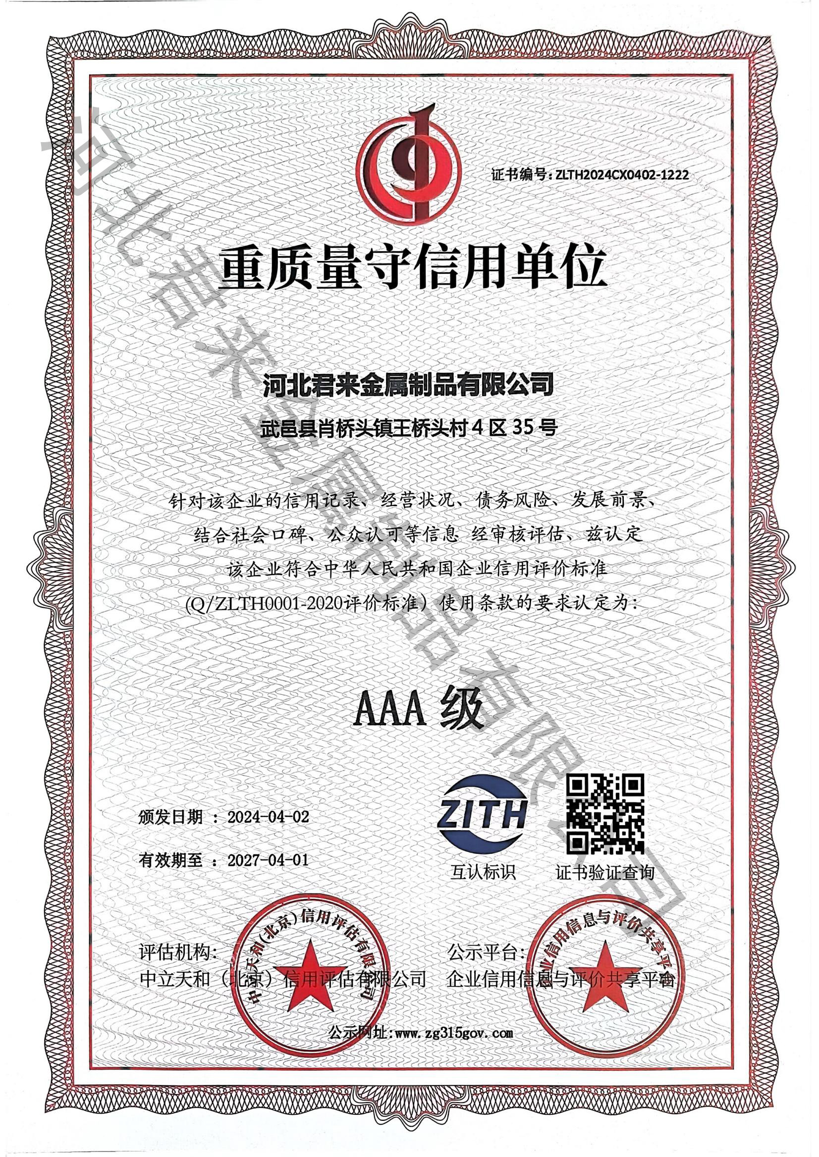 重質(zhì)量守信用等級(jí)證書(shū)